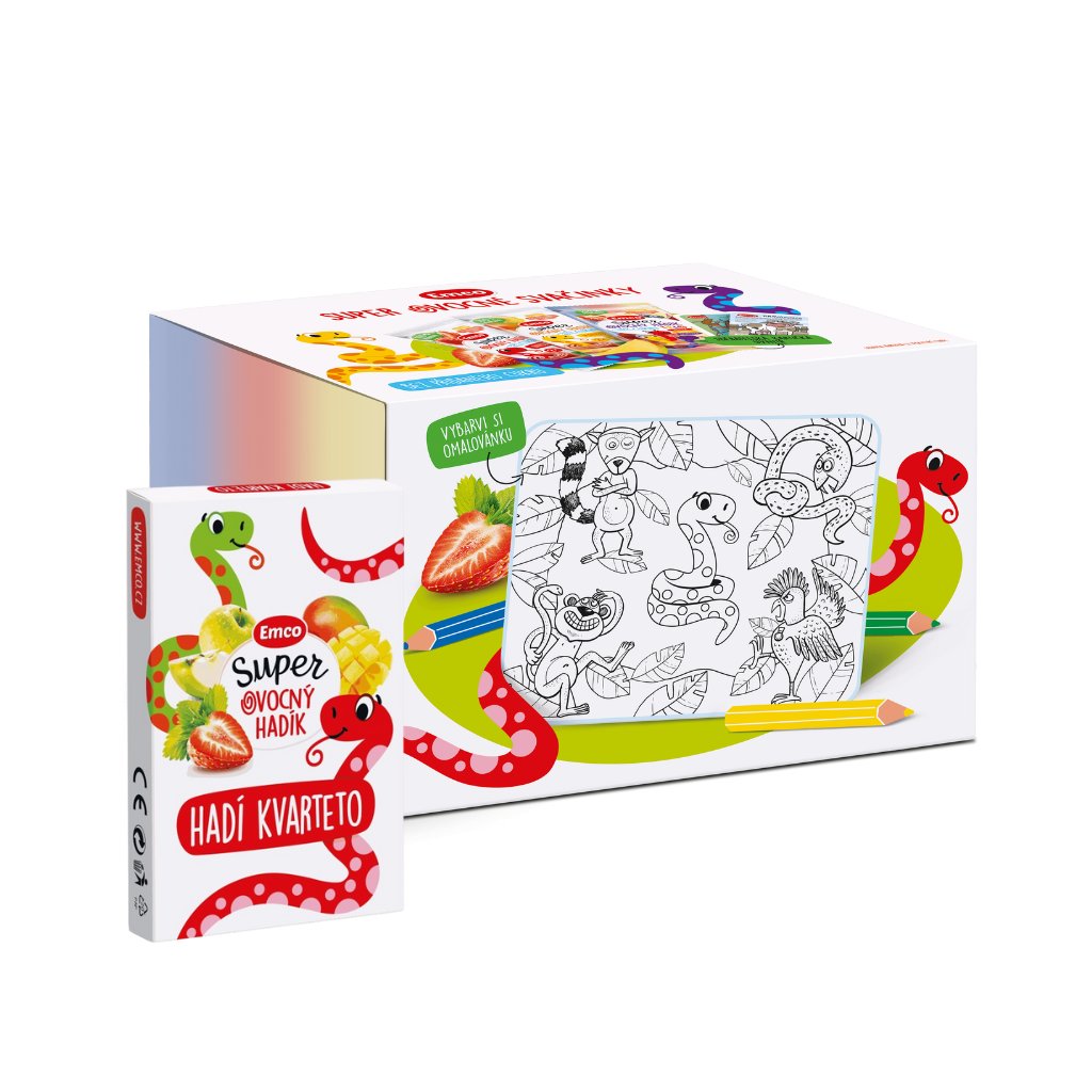 Okrem čerstvej sladkej chuti jabĺk vám hady prinášajú extra porciu zábavy. V každom balení nájdete zberateľskú kartu a v kartóne nájdete aj zábavnú hru pre celú rodinu - jedinečné Hadie kvarteto. Budete hráčom, ktorý položí na stôl najviac kvartet veselých zvieracích kamarátov hadov? Ak nie, získajte aspoň čo najviac ovocných pochutín zo zásob v balení. Je ich tam 26! 😊
