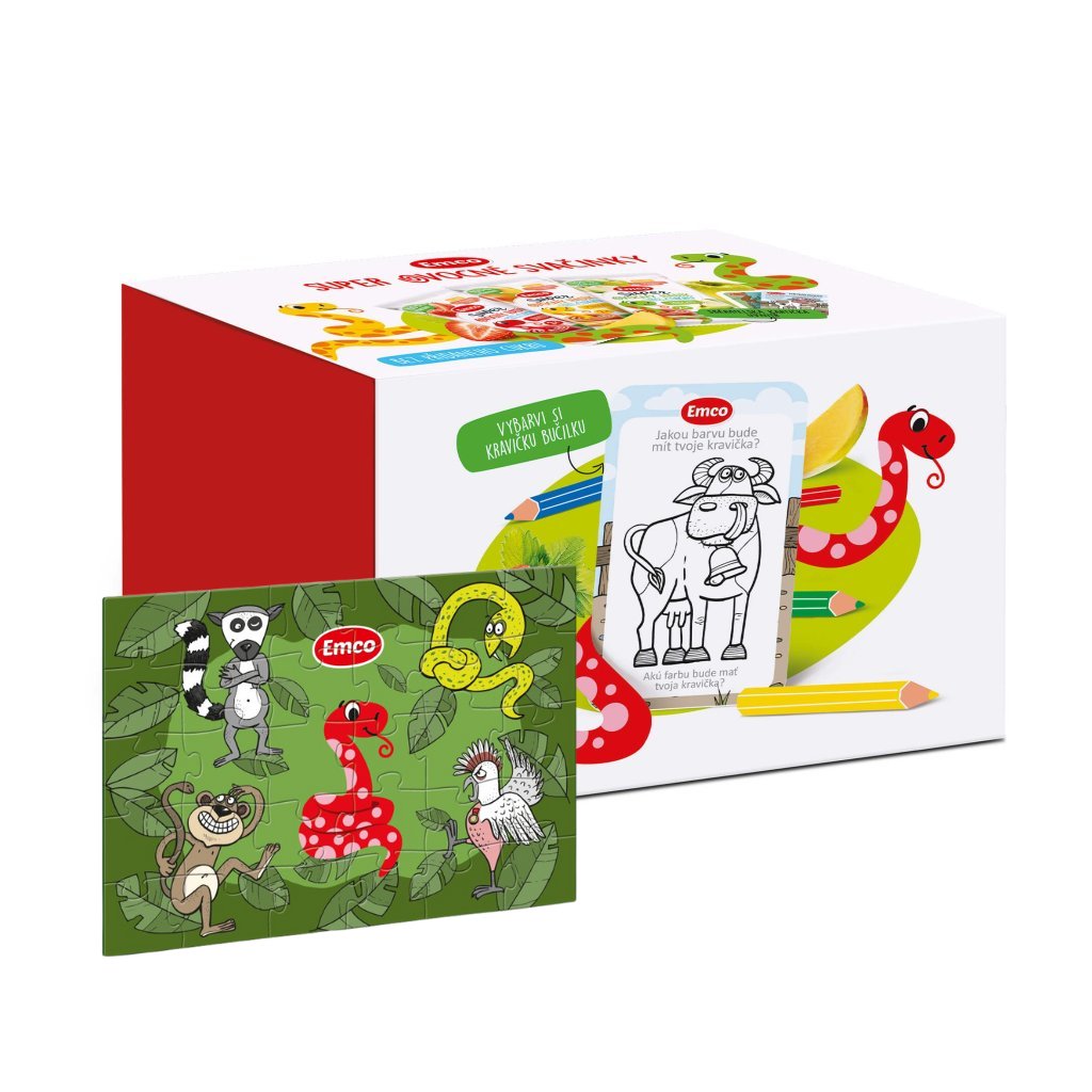 Preskúmajte aj kartónový obal. Nájdete na ňom omaľovánku, spojovačku a vystrihovačku hada.