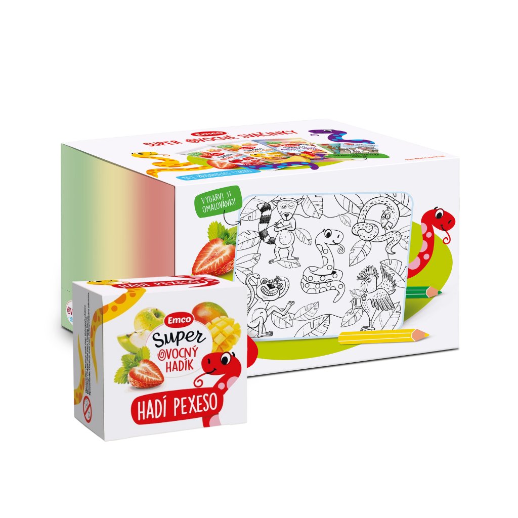 Hadíci vám okrem sviežej sladkej chuti jablka a ananásu prinášajú aj extra porciu zábavy. V každom balení totiž nájdete zberateľskú kartičku a v kartóne navyše aj zábavnú hru pre celú rodinu – jedinečný Hadí hlavolam. Kto ako prvý poskladá 9 kartičiek do štvorca a uvidí hadíkov a ich ovocie? 😊 Dajte si k tomu jednu z 26 hadích desiat v balení – pôjde vám to hneď lepšie od ruky!