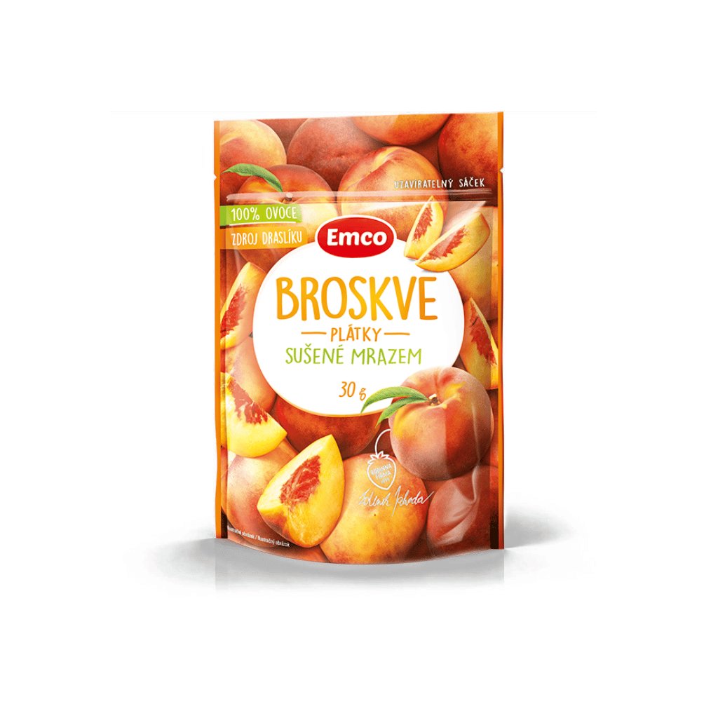 Plátky mrazom sušených broskýň. Výrobek môže obsahovat arašidy, sóju, mlieko a orechy.