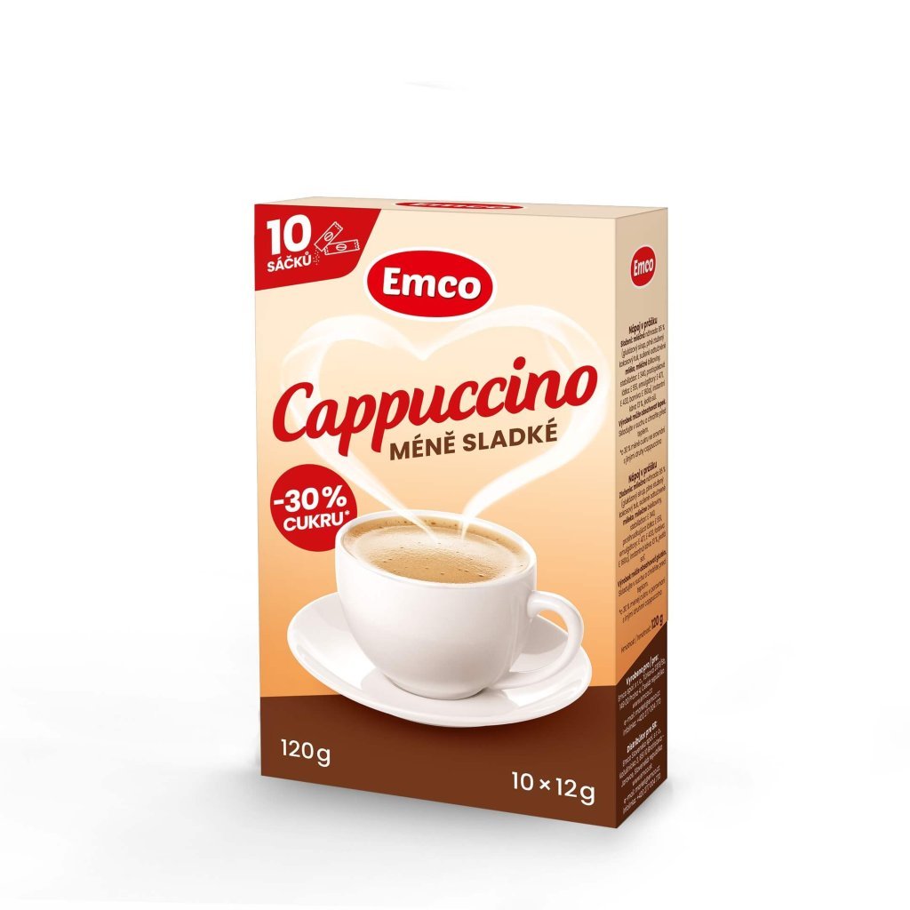 Cappuccino, ktoré obsahuje o 30 % menej cukru v porovnaní s inými druhmi cappuccina. V krabici je 10 porcovaných sáčkov tohto lahodného nápoja. Skladujte v suchu. Distribútor pre SR: Emco spol. s r.o., Türkova 2319/5b, 149 00 Praha 4, Česká republika