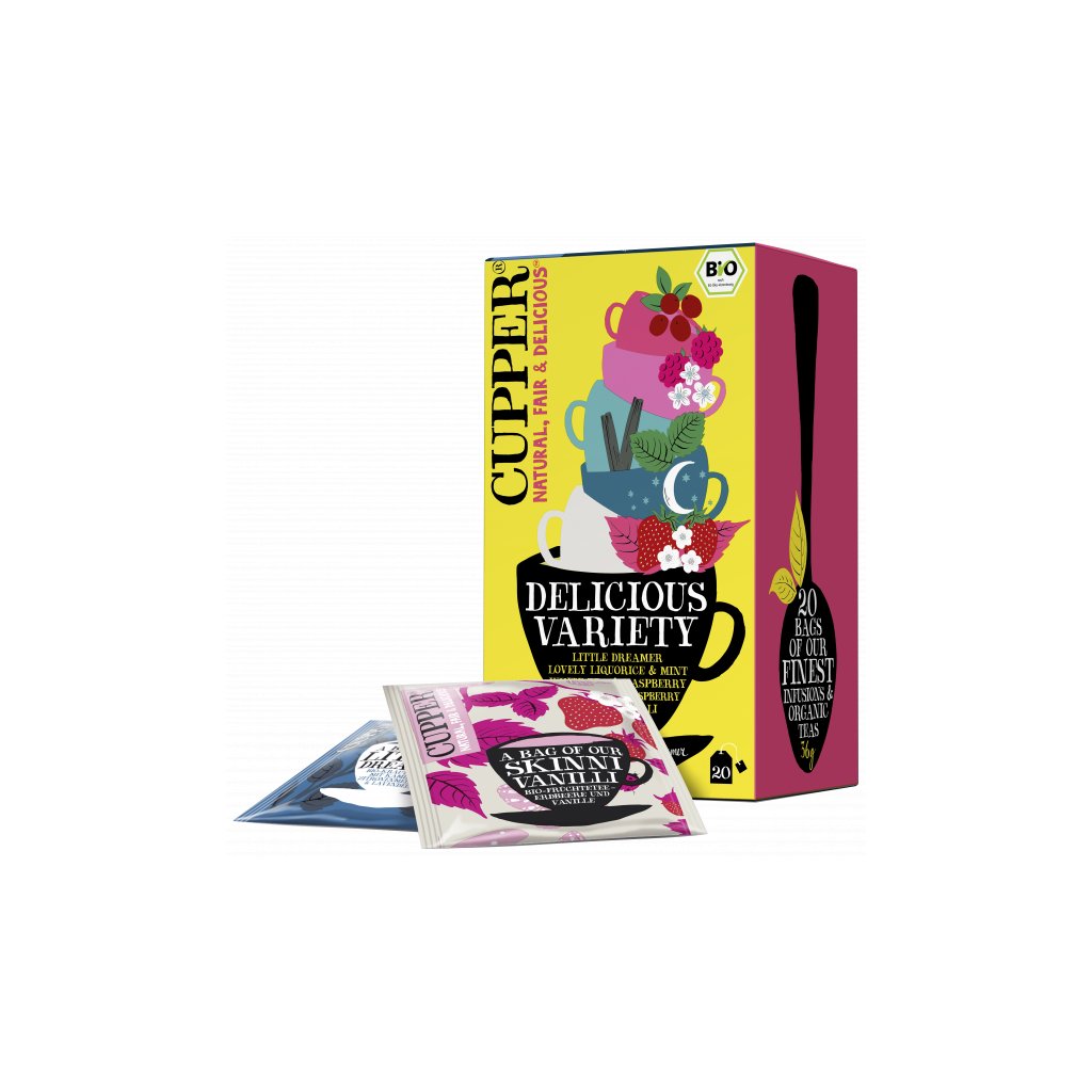 Vyskúšajte lahodný rad čajov CUPPER a objavte svoju obľúbenú príchuť. Delicious variety ponúka rozmanitosť s každou šálkou čajom. Prečo si teda vyberať jeden druh, keď existuje toľko lahodných bylinných ovocných čajov. LITTLE DREAMER LOVELY LIQUORICE & MINT WHITE TEA & RASPBERRY CRANBERRY & RASPBERRY SKINNI VANILLI CUPPER o Poctivé a kvalitné zmesi vyrobené v Anglicku o BIO čaj z čistých prírodných ingrediencií ohľaduplný k životnému prostrediu o Nebielené rastlinné vrecká bez plastu, biologicky rozložiteľné o 100% recyklovateľné obaly Bolo nebolo …. …1984 v Dorsete, malej provincii na južnom pobreží Anglicka bol namiešaný prvý čaj CUPPER a odvtedy sa tam vyrábajú lahodné organické čaje CUPPER. CUPPER verí v mnoho malých spôsobov, ako môžete robiť dobro. V súlade s heslom „prírodné, spravodlivé a chutné“ – na výrobu čajov a nálevov používa iba tie najčistejšie a najkvalitnejšie organické ingrediencie a platí za čaj spravodlivú cenu. Dajte si šálku čaju CUPPER, pohodlne sa usaďte a vychutnajte si ten najchutnejší spôsob, ako urobiť niečo dobré.