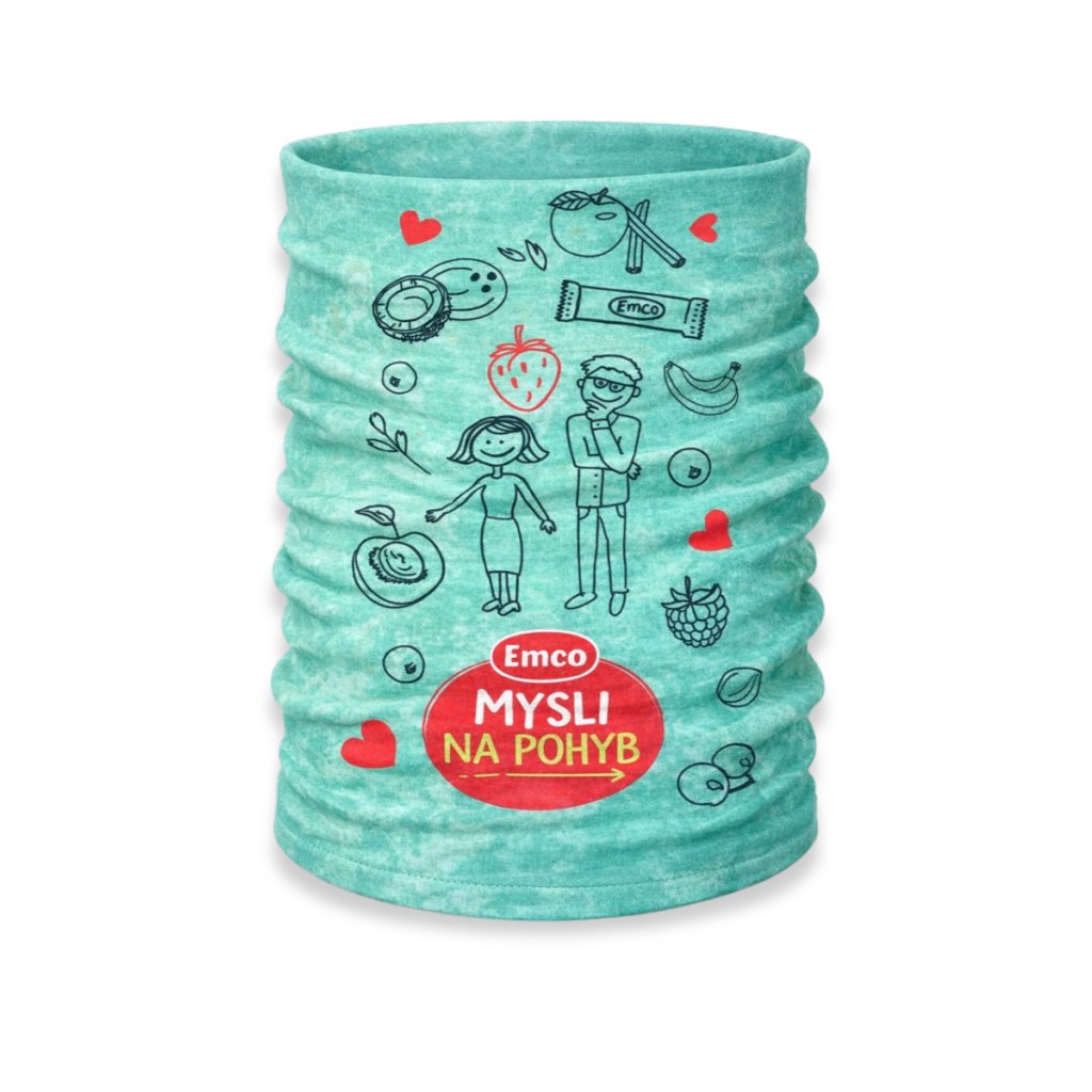 Hravý multifunkčný nákrčník Emco s ilustráciami inšpirovanými zdravým životným štýlom. Motív ovocia, energie a pohybu v kombinácii s logom „Mysli na pohyb“ dokonale vystihuje filozofiu značky Emco. Ideálny na šport, voľný čas aj ako výrazný štýlový doplnok.