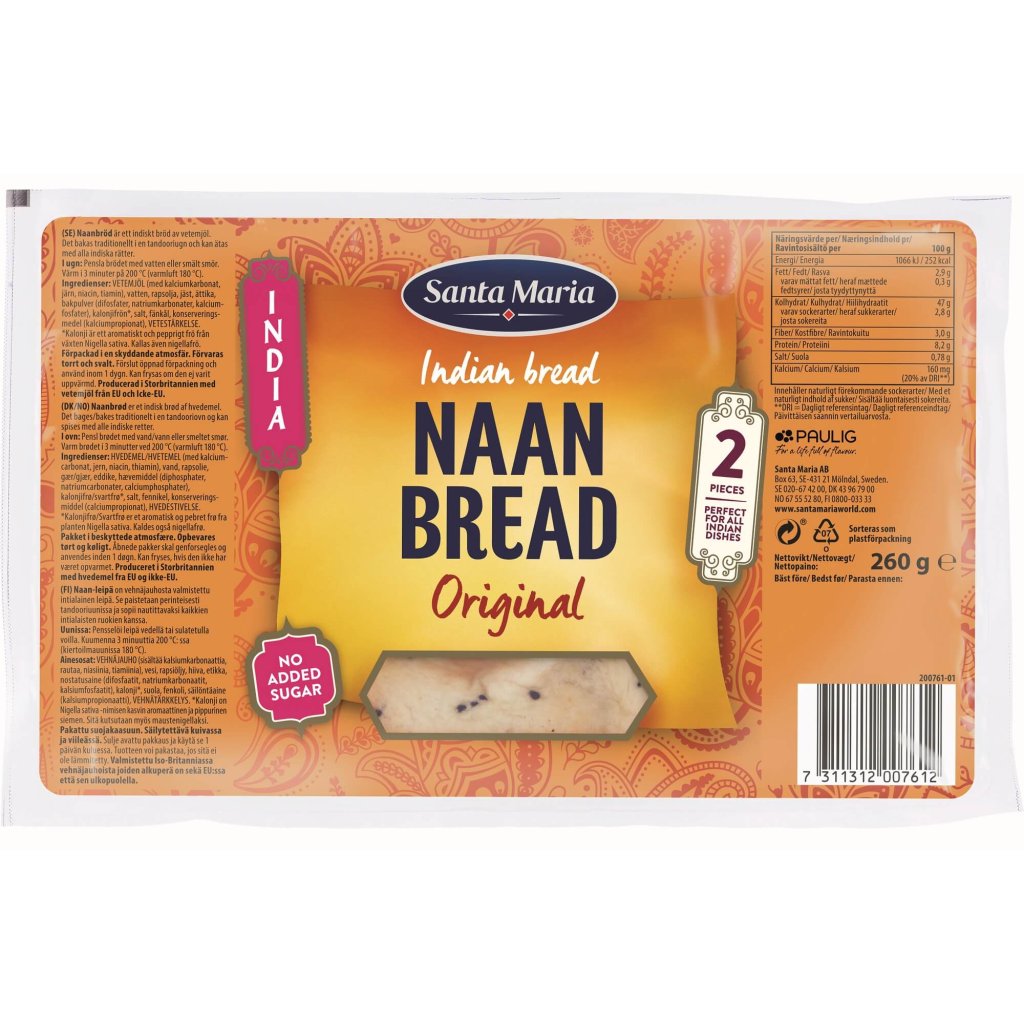 Naan Bread je klasický mäkký indický chlieb, ktorý sa hodí k všetkým indickým pokrmom. Santa Maria Naan chleby sú naviac všetky ochutené semienkami čiernej rasce. Stačí len upiecť v rúre do chrumkava alebo ohriať v mikrovlnnej rúre. Každé balenie obsahuje 2 chleby, čo sú dostačujúce 4 porcie.