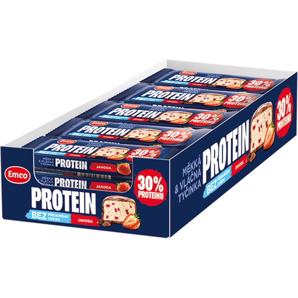 Nová proteínová tyčinka Emco obsahuje 30 % proteínu a je bez pridaného cukru. Mäkký a vláčny základ tyčinky obsahuje kúsky mrazom sušených jahôd, kolagén a je poliaty mliečnou čokoládou bez pridaného cukru.