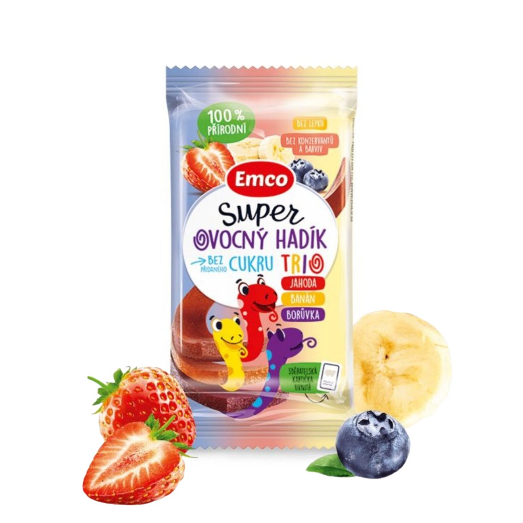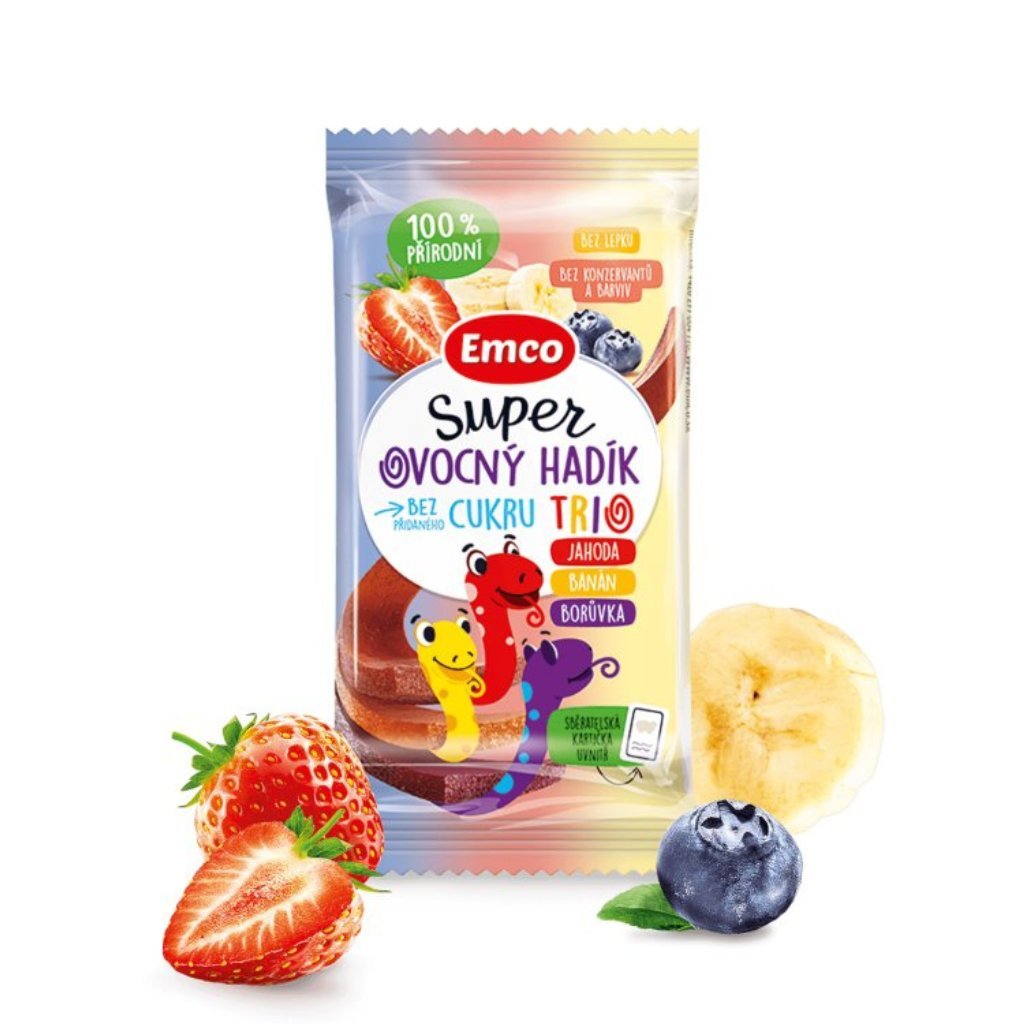 Super ovocná desiata nielen pre deti. Ideálna do školy pre každého maškrtníka. V balení sa skrývajú 2 ovocné trojité pásiky kombinujúce 3 príchute – hadíky. Hadíky neobsahujú žiadny pridaný cukor a sladké sú len vďaka ovociu. Hravo a zdravo nahradia cukríky či iné sladkosti. Súčasťou balenia je zberateľská kartička.